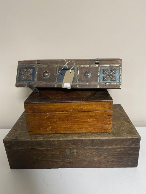 An eastern hardwood metal bound table box and two Victorian boxes.