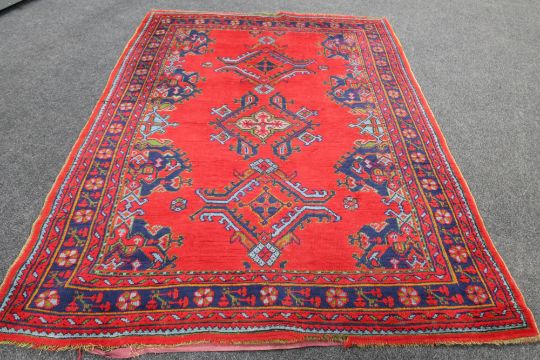 A Persian woollen rug of geometric design on red ground, 273cm by 186cm