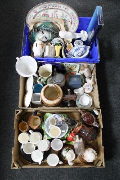 Two boxes and a crate of assorted china to include, antique meat plates, commemorative mugs, figurines, horse head bookends, china money boxes etc