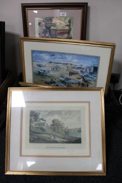 A box of seven assorted framed pictures and prints to include scenes of Paris, black and white etching, Edmund Miller aircraft prints etc.