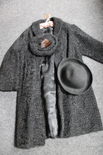 A lady's quilted fur jacket with matching hat together with one other hat and shoulder bag