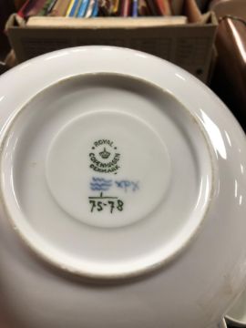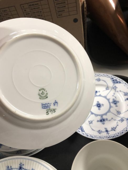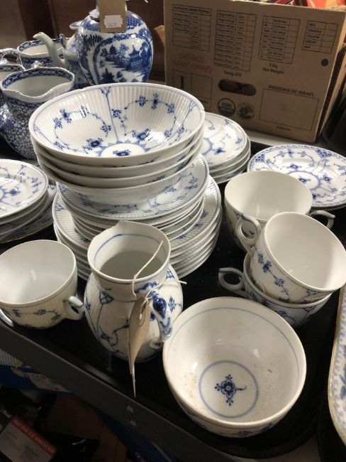 Comprising: Milk jug with chipped spout. Seven side plates. Three coffee cups. One teacup (handle restored). Four bowls (three are chipped). Fourteen various saucers, two of which are a different pattern.