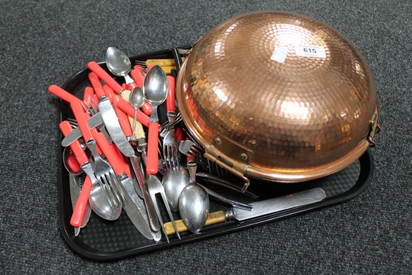 A tray of copper lidded cooking dish together with stainless steel and plated cutlery
