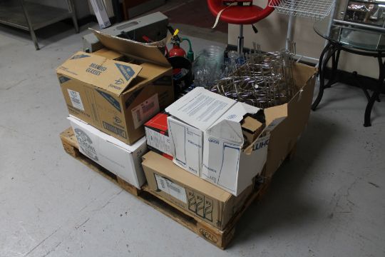 A pallet of metal plate stands, drinking glasses, wooden easel, fire extinguishers, etc.