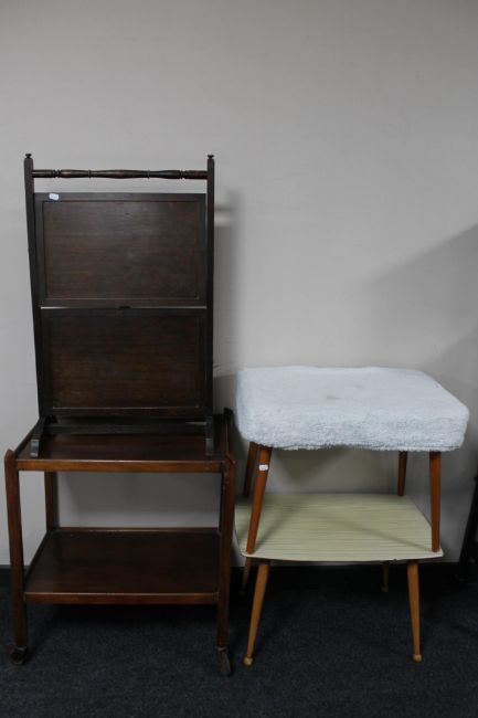 An oak two tier folding cake stand, trolley, mid 20th century dressing table stool and a melamine topped table.