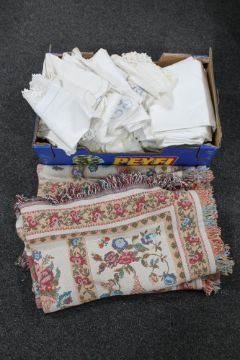 A box of a quantity of embroidered table linen and two fringed tapestry throws