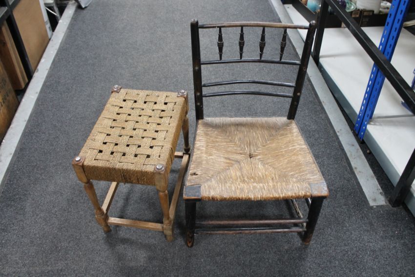 An antique pine rush seated chair and an oak stool.