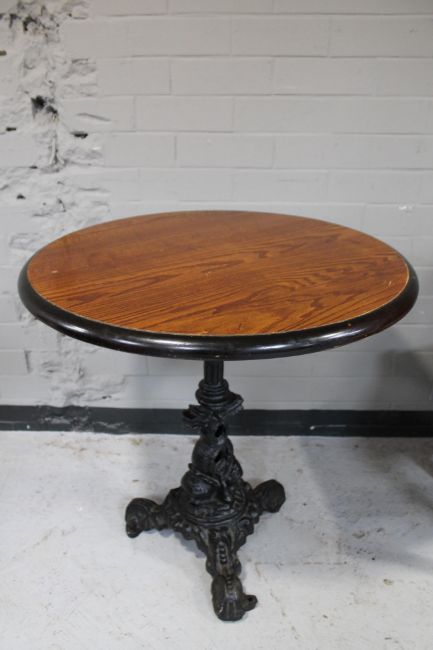 A circular topped pub table on cast iron tripod base.