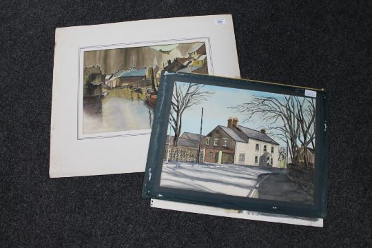 J. W. Masson : Fishing boats in calm waters, watercolour, signed, 28 cm x 40 cm, together with another watercolour by the same artist depicting a street scene, both parts unframed. (2)