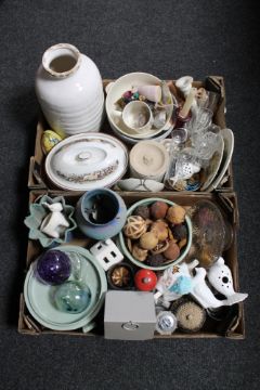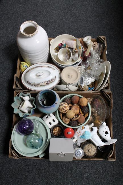 Two boxes of antique and later glass, Wedgwood tureen, pottery vases, candle holders, wall plates etc