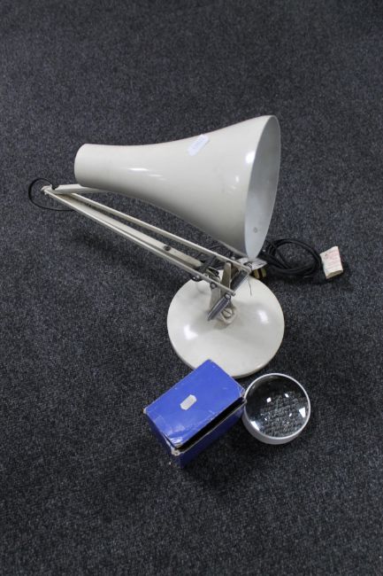A mid 20th century metal angle poise lamp together with a boxed glass lens