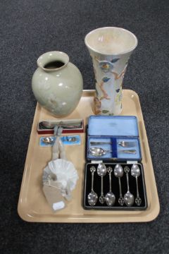 A tray of cased Northern Goldsmiths baby spoon and fork together with other plated cutlery, Arthur Wood lustre vase, Nao figure of a ballerina etc