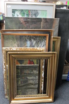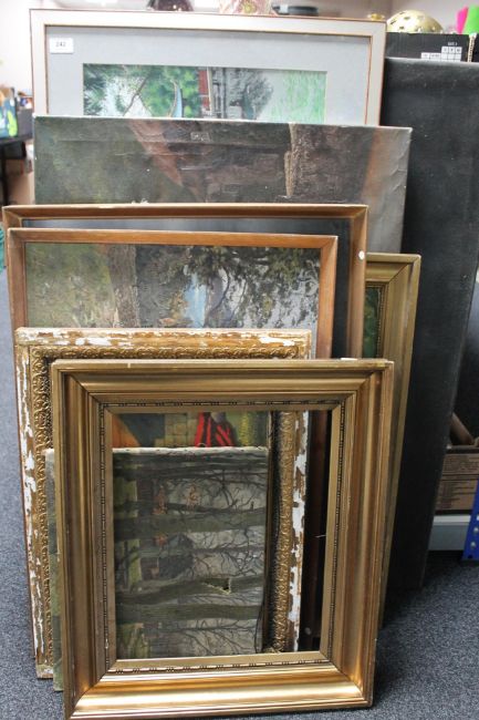 A collection of pictures to include continental school oils on canvas, mid 20th century oil on canvas of tribal figures dancing, Chinese tapestry depicting pagodas etc