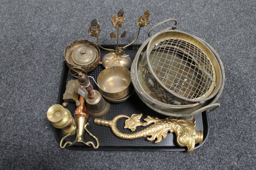 A tray of metalware, brass hand bell, brass bowls, matchbox holder on paw feet etc