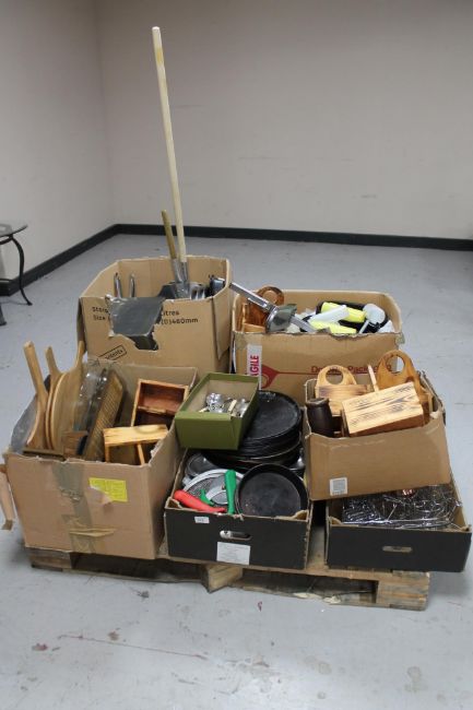 A pallet of six boxes of cooking trays, pizza paddles, mixing bowls, wooden condiment stands, cutlery, commercial can opener, etc, etc.