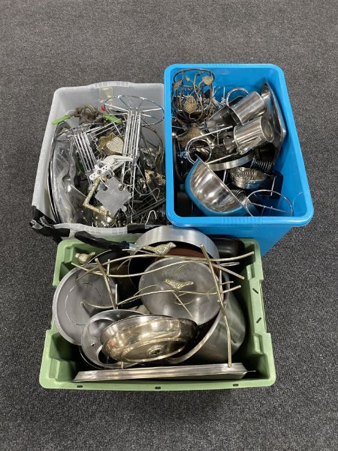 Three boxes of stainless steel kitchen bowls and dishes, oven dishes, egg cup holders etc