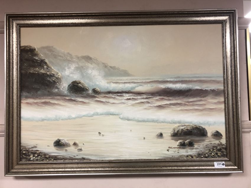 ** Helverson : Choppy waters and a rocky headland, oil on canvas, signed, 50 cm x 76 cm, framed.