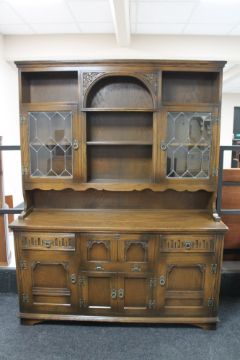 An eight piece Old Charm dining room suite comprising dresser, refectory table and six chairs.