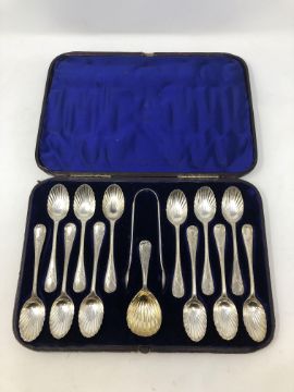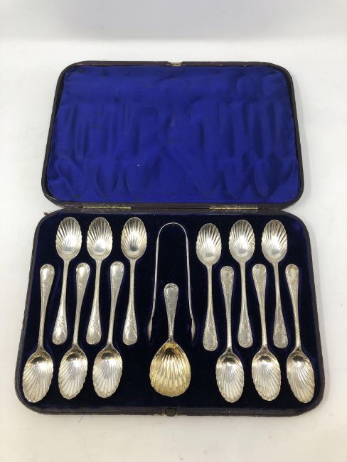 A Victorian cased set of twelve silver spoons, tongs and matching caddy spoon.
