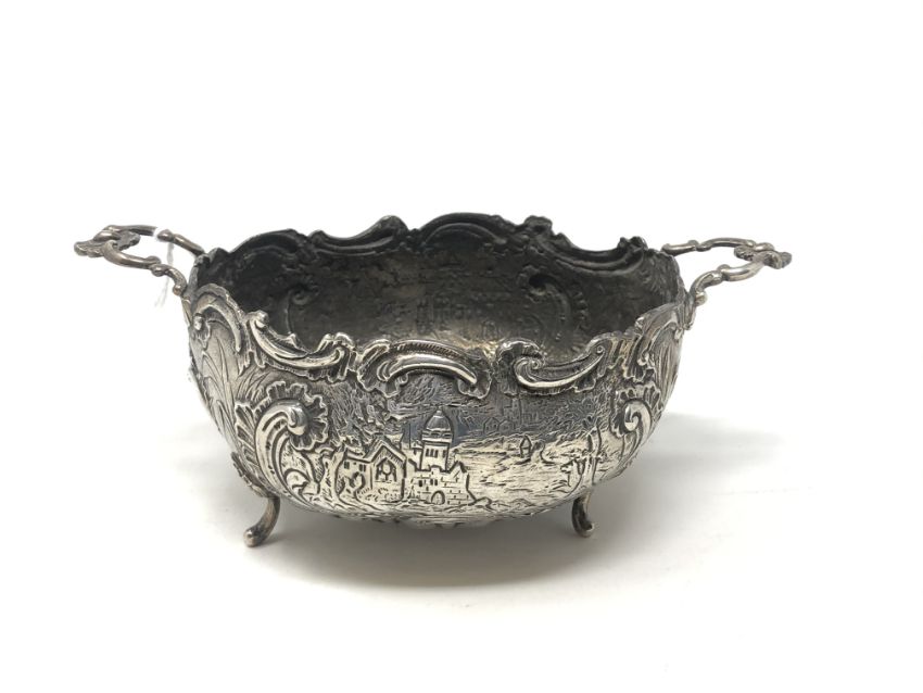 An ornate early 19th century twin handled silver bowl depicting a country scene