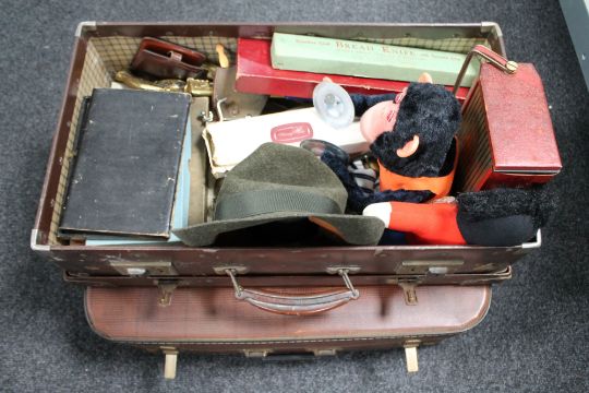 Two vintage luggage cases of assorted brass ware, mid 20th century mechanical monkey, vintage trilby hat, transistor radio etc