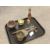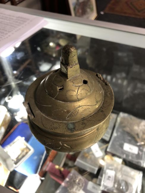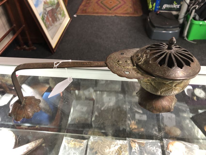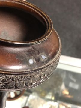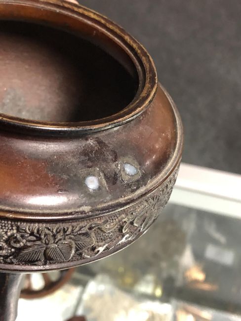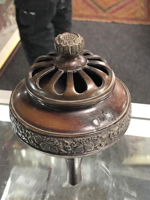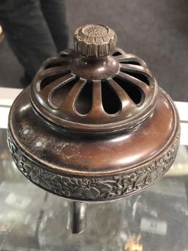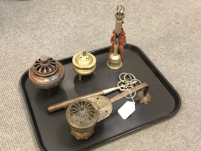 A Meiji period Japanese censer of lotus shape together with a Shakujo, Gokorei, bronze censer and one other small pot. (5)