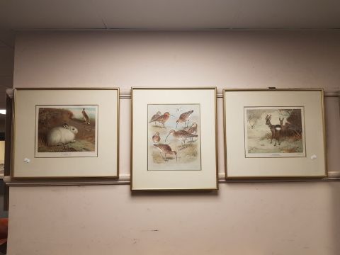 After Archibold Thorburn : The Mountain Hare, colour print, 28 cm x 24 cm, together with two further colours prints by the artist and J G Millais. (3)