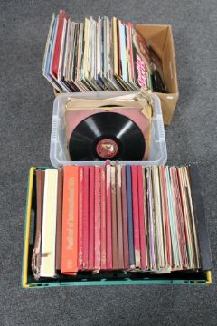 A box and two crates containing a large quantity of vinyl LP's including compilation albums, box sets, Nat King Cole etc