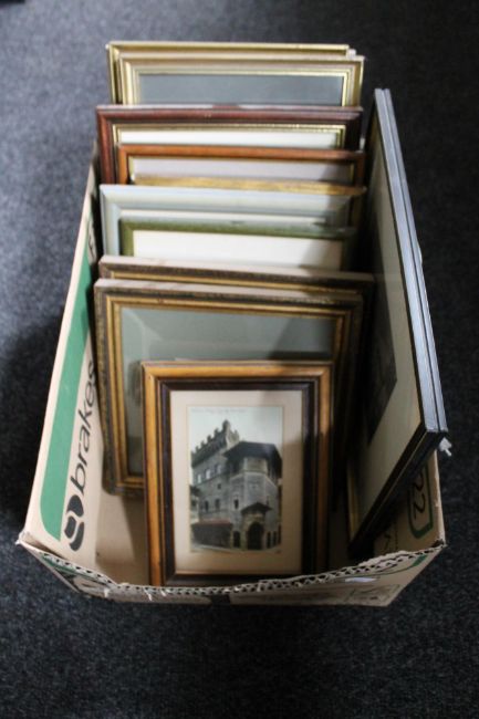 A box of pictures, black and white engravings, framed continental postcards, book plates of flowers etc