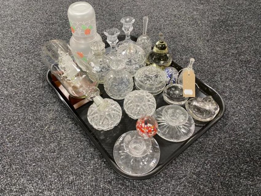 A tray of assorted glass ware - perfume bottles, paperweights, powder bowls, ship in bottle etc
