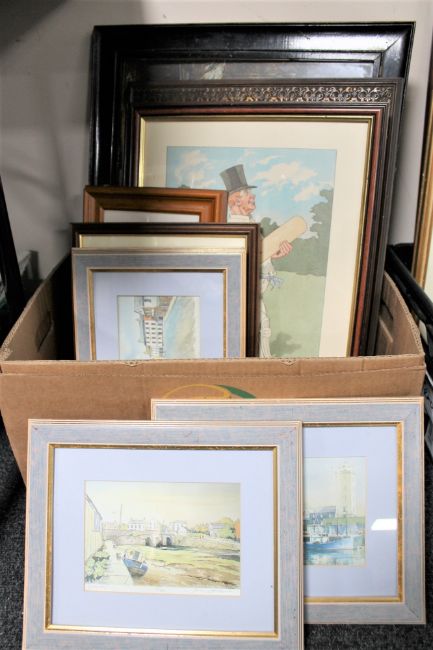 A box of seven assorted framed pictures and prints to include signed limited edition prints, North Shields fish quay, Mac Gissar print The Connoisseur, photograph, two framed Kyd cricketing characters, etc.