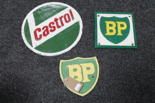 Three cast iron plaques - Two BP and Castrol
