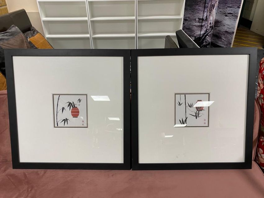 A pair of Japanese black framed prints depicting hanging baskets and foliage