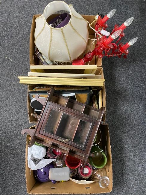 Three boxes of framed pictures, table lamps, candle holders, wall mounted curio cabinet