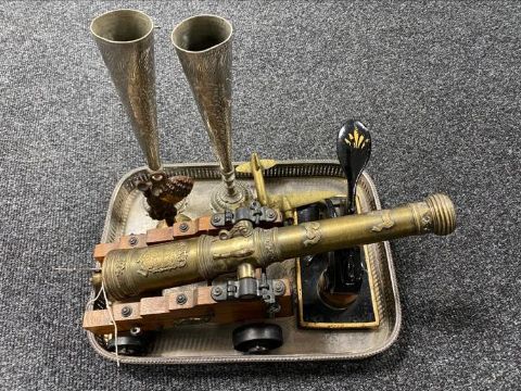 A silver plated gallery tray, brass El Tigre cannon on stand, vintage punch, plated vases etc