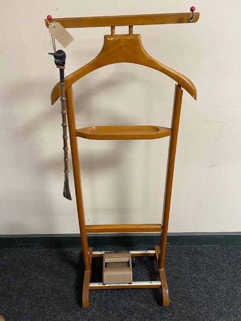 A mid century valet stand together with a tie master roller and shoe horn with jockey head handle