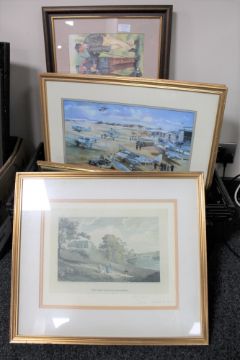 A box of seven assorted framed pictures and prints to include scenes of Paris, black and white etching, Edmund Miller aircraft prints etc.