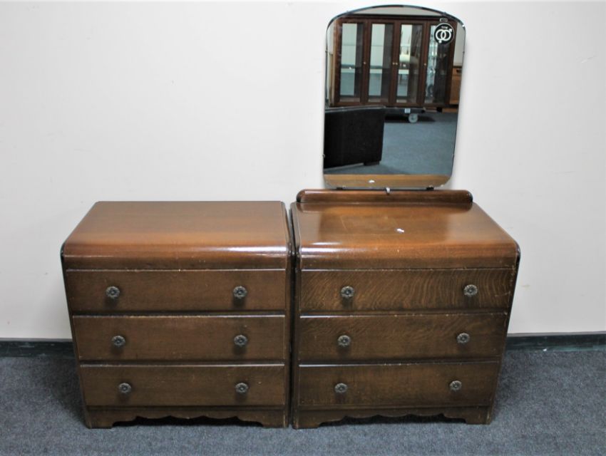 A mid century three drawer oak chest with matching dressing chest