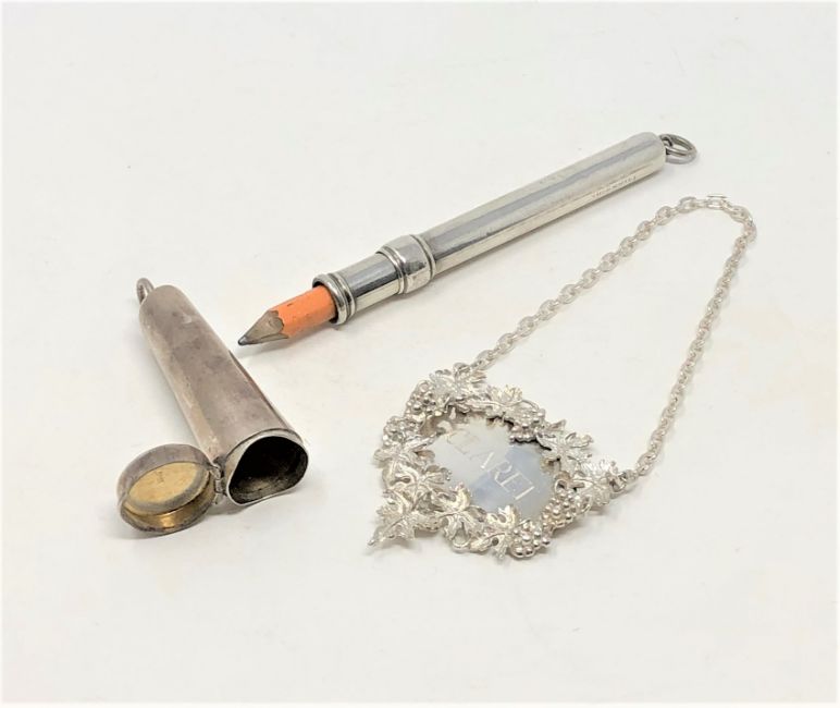 A silver pencil holder, a silver cheroot and a good quality silver Claret decanter label (3)