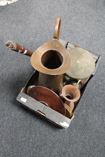 A box of antique metal ware to include, copper bed warming pan, copper jugs, trivets etc