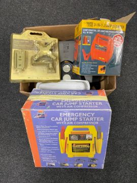 A box of car jump starter, grill, LCD wall mount, further boxed car jump starter etc