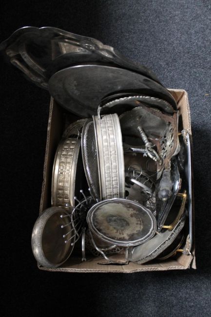 A box of antique and later plated wares, stainless steel trays, brass trivet etc