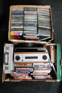 Two boxes of stereo integrated turntable, assorted CD's and DVD's, aluminium case containing record cleaning equipment