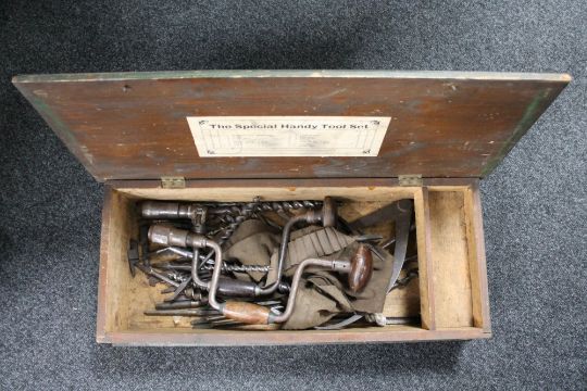 A vintage wooden tool box, hand tools including drill bits, braces etc