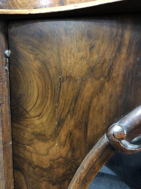 119cm wide by 38cm deep by 83cm high. Scuffs and scratches to veneer. Some veneer losses. Small losses to mouldings. See images.