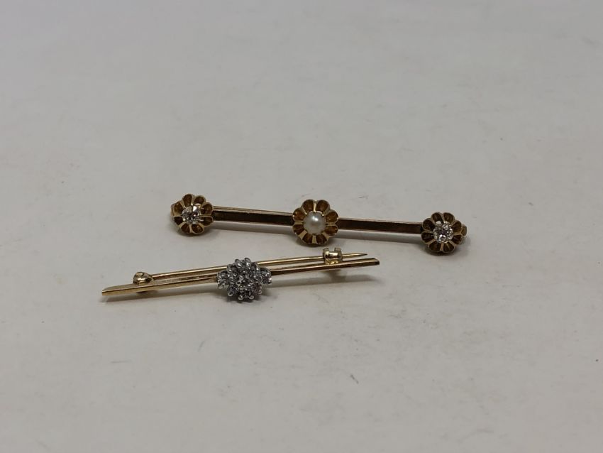 A gold split pearl and diamond bar brooch and a 9ct gold diamond set bar brooch (2)