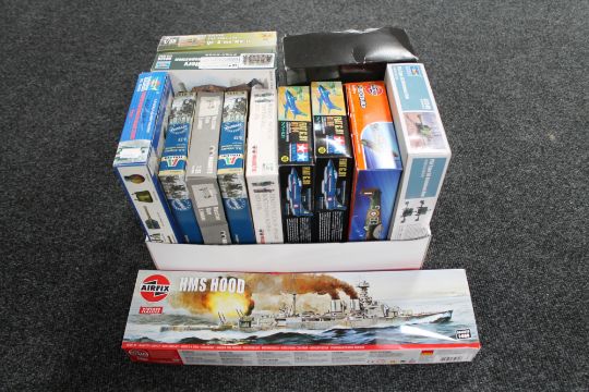 A box of Airfix Tamiya trumpeter plastic modelling kits