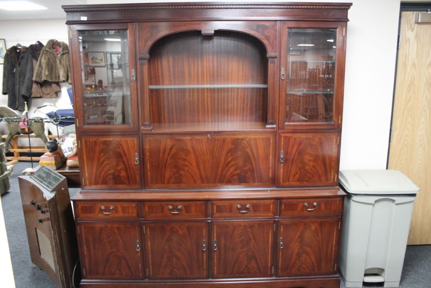 An inlaid mahogany Strongbow cocktail display unit fitted with cupboards and drawers beneath