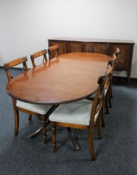 An eight piece Regency style inlaid mahogany dining room suite - sideboard, pedestal extending table with leaf and six chairs