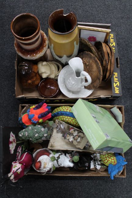 Two boxes of contemporary figures, jewellery stand, West German vases, wall plaques, jug and basin etc